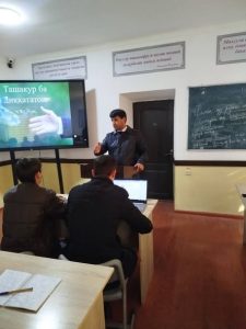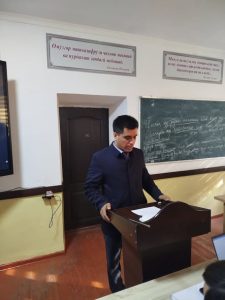 Дар маҳфил донишҷӯи курси 3-юми ихтисоси география ҳифзи табиат Қурбонов Дилшод, дар мавзуи “Ифлосшавии табиат ва масъалаҳои ҳифзи муҳити зист” маърӯза намуд.