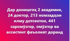 – дар таҳсили рӯзона 104 ихтисос; – дар таҳсили фосилавӣ 53 ихтисос; Аз ҷумла, ихтисосҳои нав: 1. 1-310401-02-02 Информатикаи физикавӣ 2. 1-020307 Забони англисӣ. Забони кореягӣ 3. 1-210601-01 Забони муосири хориҷӣ (англисӣ-арабӣ) 4. 1-310501-02 Химия (фаъолияти илмию педагогӣ) 5. 1-330101-05 Экология. Химия 6. 1-020404 Биология, ихтисоси иловагӣ ҳимояи наботот 7. 1-020404-07 Биология. Дендрология 8….