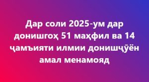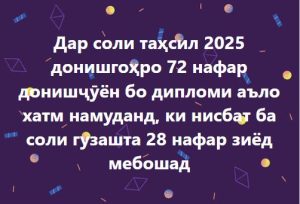 Соли таҳсили 2024-2025 ДДБ ба номи Носири Хисравро 72 нафар донишҷӯён бо дипломи аъло хатм карданд, ки ин нисбати ба соли таҳсили 2024-2025 28 нафар зиёд мебошад. Дар ин бора ректори донишгоҳи мазкур Маҳмадалӣ Қурбонзода зимни нишасти хабарӣ иттилоъ дод. Айни замон замон дар ин донишгоҳ 23011 нафар донишҷӯ дар шӯъбаҳои рӯзона ва ғоибона таҳсил…